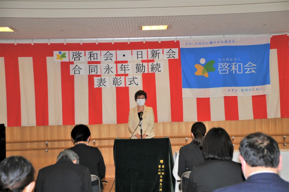 令和3年3月17日、特別養護老人ホームしょうぶ苑地域交流スペースにて、社会福祉法人啓和会と医療法人社団日新会での合同永年勤続表彰式を執り行いました。