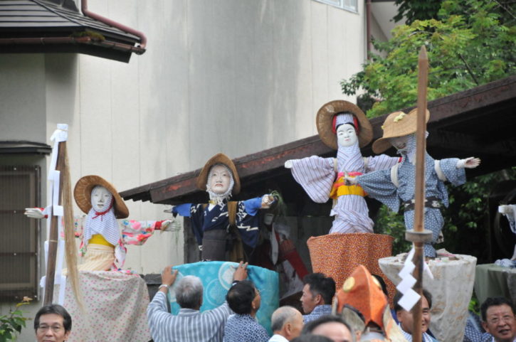 昔ながらの田植え風景が再現され、デコと呼ばれる人形を田の畔に立て、田植歌に合わせて小学生による早乙女と手助けする白狐(狐のお面を着け農具を持った子供)が儀礼的な田植えを行います。