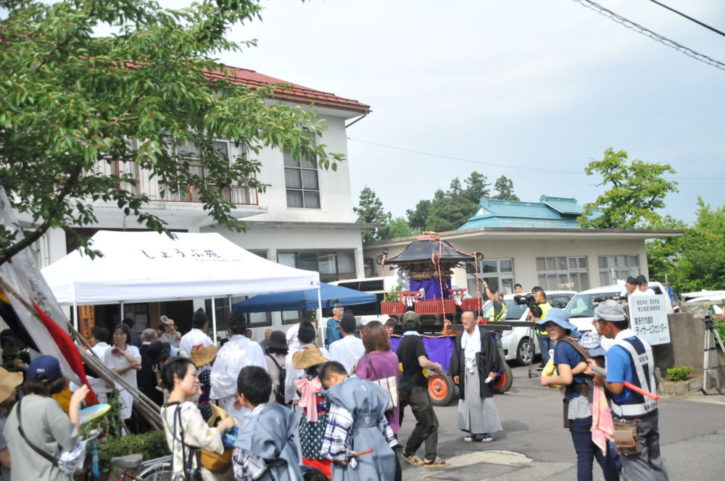 本会が運営している「喜多方市慶徳デイサービス」が神輿渡御のルートに入っておりましたので、休憩所を提供しました。早乙女・白狐役の喜多方市立慶徳小学校児童で賑わっていました。