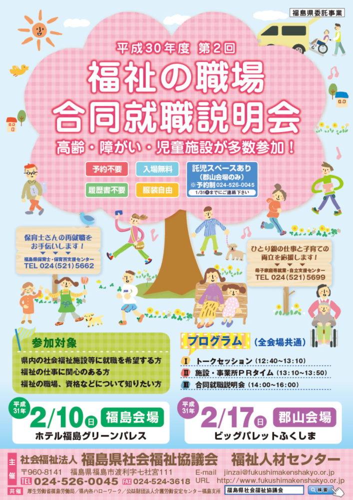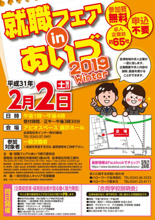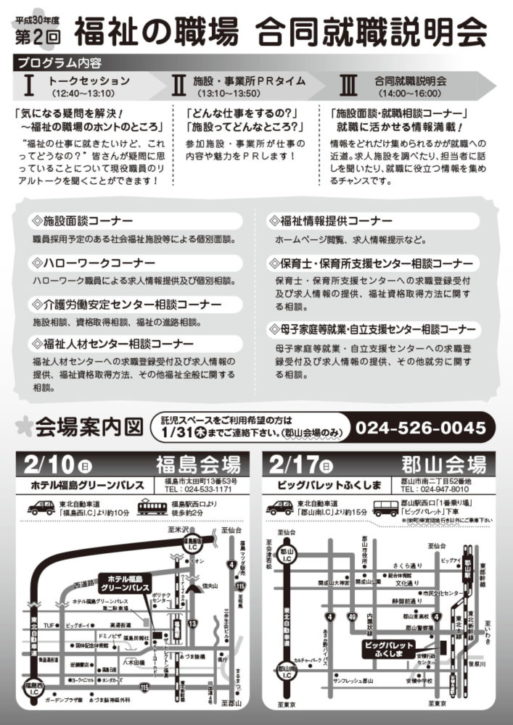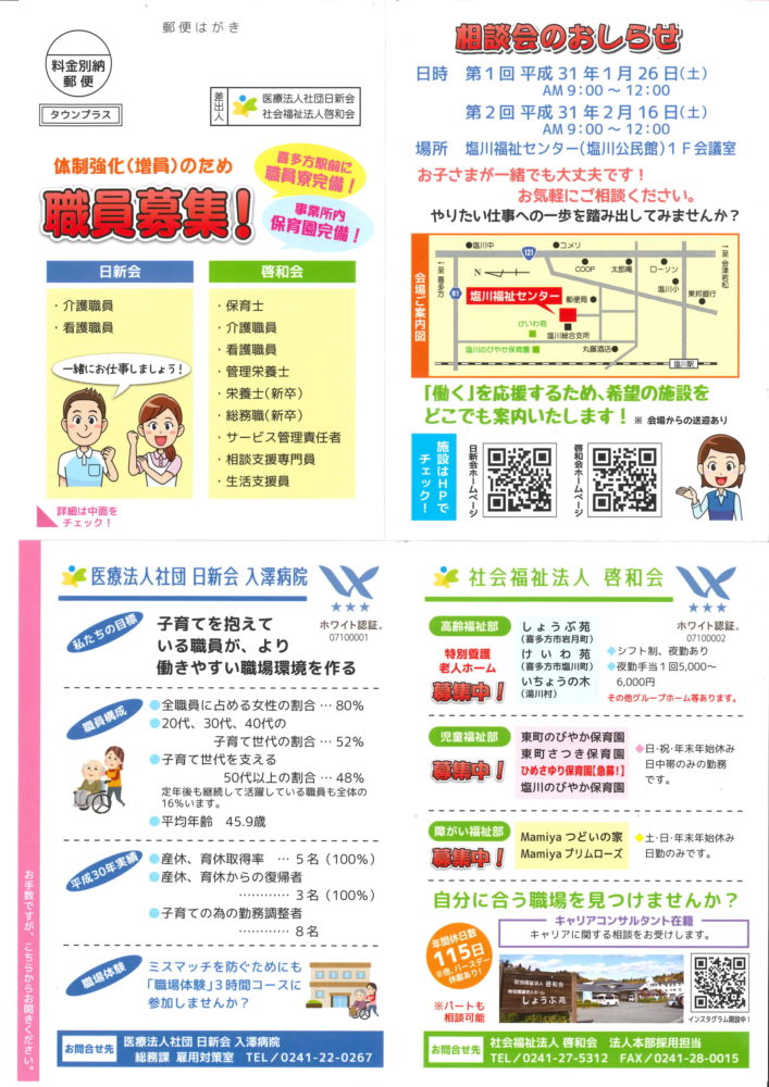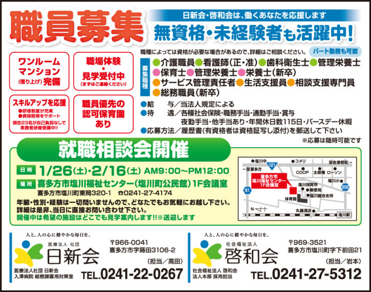 明日1月26日(土)及び2月16日(土)に塩川福祉センター(公民館)にて就職相談会を開催します。