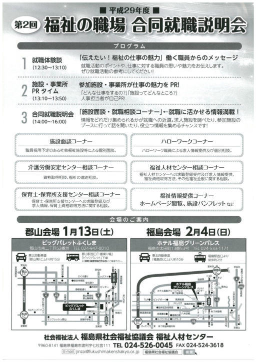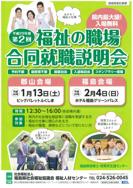 2017年12月15日 平成30年1月13日(土)にビッグパレットふくしまで開催される 「福祉の職場合同就職説明」へ参加します。 詳細はチラシのとおりです。 現在は介護職員だけでなく、保育士、総務職、その他の職種も募集を行っておりますので、 興味がある方はぜひ、足を運んでいただけると幸いです。 予約不要ですので、皆さんのご参加、お待ちしております!