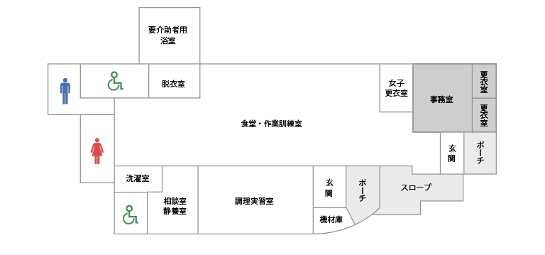 | サービス内容 | 生活介護 常に生活を必要とする人に、日中帯で入浴、排泄、食事の介護等を行うとともに、創作活動の機会を提供します。 |